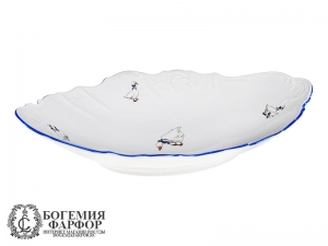 Блюдо Бернадотт для подачи хлеба изготовлено из белого фарфора чешской компанией Thun 1794. Данный предмет из серии Bernadotte, выполнен в декоре Гуси. Край борта украшен синей обводкой.