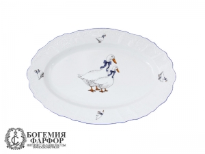 Блюдо овальное Бернадотт изготовлено из белого фарфора чешской компанией Thun 1794. Данный предмет из серии Bernadotte, выполнен в декоре Гуси. Край борта украшен синей обводкой.