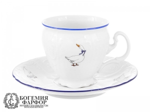 Набор кофейных пар Бернадотт изготовлен из белого фарфора чешской компанией Thun 1794. Данный товар из серии Bernadotte, выполнен в декоре Гуси. Край борта украшен синей обводкой.