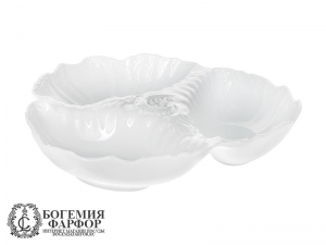 Менажница Бернадотт для подачи закусок изготовлена из белого фарфора чешской компанией Thun 1794. Данный предмет из серии Bernadotte, выполнен без декора. Посуда может использоваться для ресторанов и кафе. Край борта украшен рельефом.