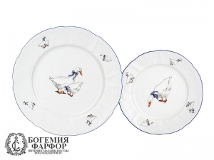Набор десертных тарелок 21 см, Бернадотт для подачи сладких блюд изготовлен из белого фарфора чешской компанией Thun 1794. Данный товар из серии Bernadotte, выполнен в декоре Гуси. Край борта украшен синей обводкой.