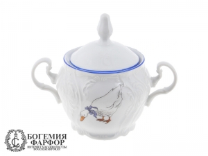 Сахарница Бернадотт с крышкой изготовлена из белого фарфора чешской компанией Thun 1794. Данный предмет из серии Bernadotte, выполнен в декоре Гуси. Край борта украшен синей обводкой.