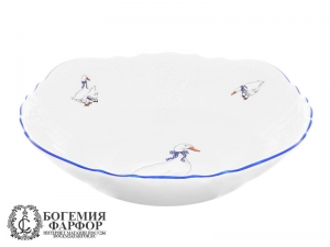 Салатник Бернадотт круглый изготовлен из белого фарфора чешской компанией Thun 1794. Данный предмет из серии Bernadotte, выполнен в декоре Гуси. Край борта украшен синей обводкой.