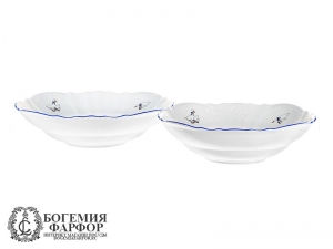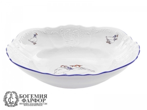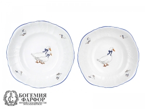 Салатник Бернадотт 25 см круглый изготовлен из белого фарфора чешской компанией Thun 1794. Данный предмет из серии Bernadotte, выполнен в декоре Гуси. Край борта украшен синей обводкой.