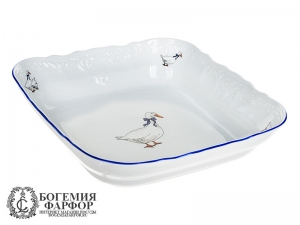 Салатник Бернадотт квадратный, 25 см изготовлен из белого фарфора чешской компанией Thun 1794. Данный предмет из серии Bernadotte, выполнен в декоре Гуси. Край борта украшен синей обводкой.