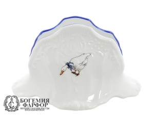 Салфетница Бернадотт изготовлена из белого фарфора чешской компанией Thun 1794. Данный предмет из серии Bernadotte, выполнен в декоре Гуси. Край борта украшен синей обводкой.
