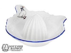 Соковыжималка Бернадотт для отжима лимона Бернадотт изготовлена из белого фарфора чешской компанией Thun 1794. Данный предмет из серии Bernadotte, выполнен в декоре Гуси. Край борта украшен синей обводкой.
