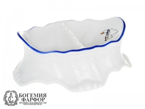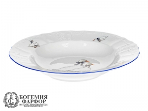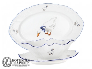 Столовый сервиз Бернадотт изготовлен из белого фарфора чешской компанией Thun 1794. Данный сервиз из серии Bernadotte, выполнен в декоре Гуси. Край борта украшен синей обводкой.