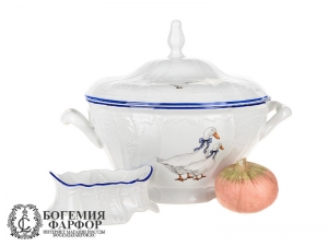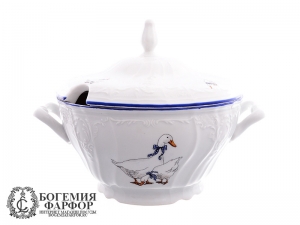 Супница 2500 мл Бернадотт, изготовлена из белого фарфора чешской компанией Thun 1794. Данный предмет из серии Bernadotte, выполнен в декоре Гуси. Край борта украшен синей обводкой.